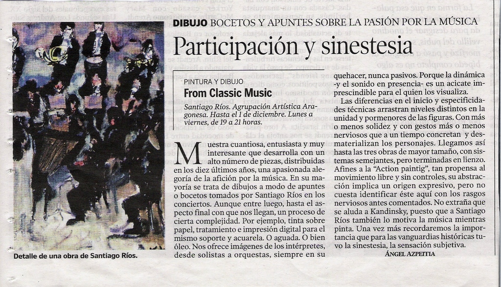 En esta exposición presenté cuarenta cuadros inspirados en la audición de música clásica en las salas de concierto, principalmente en el Auditorio de Zaragoza. Agradezco a la Sociedad Filarmónica de Zaragoza en su centenario, el patrocinio del Catálogo de esta Exposición. Aproximadamente la mitad son originales dibujados a tinta sobre el Programa de los conciertos, muchos de los cuales han sido publicados ilustrando las críticas de música del Heraldo de Aragón. Algunos de éstos dibujos los trato e imprimo digitalmente sobre diferentes soportes de papel con suficiente gramaje como para aplicarles color con aguadas a la tinta, acuarelas, guaches y/o óleo. A veces la audición de música, sobre todo, contemporánea, me motiva para hacer sobre papel dibujos abstractos. Previo tratamiento digital los imprimo sobre lienzo, terminándolos con óleo en el Estudio oyendo la misma música que me motivó el dibujo abstracto madre. A continuación presento algunos ejemplos de todo ello. La crítica de esta exposición la realizó Angel Azpeitia y apareció en el Heraldo de Aragón del 23 de noviembre de 2006.
