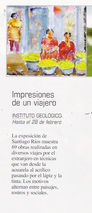 En esta muestra se expusieron algunos de los dibujos y acuarelas realizados en diversos viajes al extranjero. Se presentaron ejemplos realizados en los viajes a Egipto, Marruecos, Tibet, Nepal, Argelia y Venecia, entre 1999 y 2007. También algunos cuadros en acrilico pintados, generalmente, en mi Estudio. Con motivo de esta muestra se edito un diptico que se enseña aqui debajo y un catalogo con 69 reproducciones. ► (VIDEO de la entrevista que me hizo ESMADRIDTV en el lugar de la muestra) |