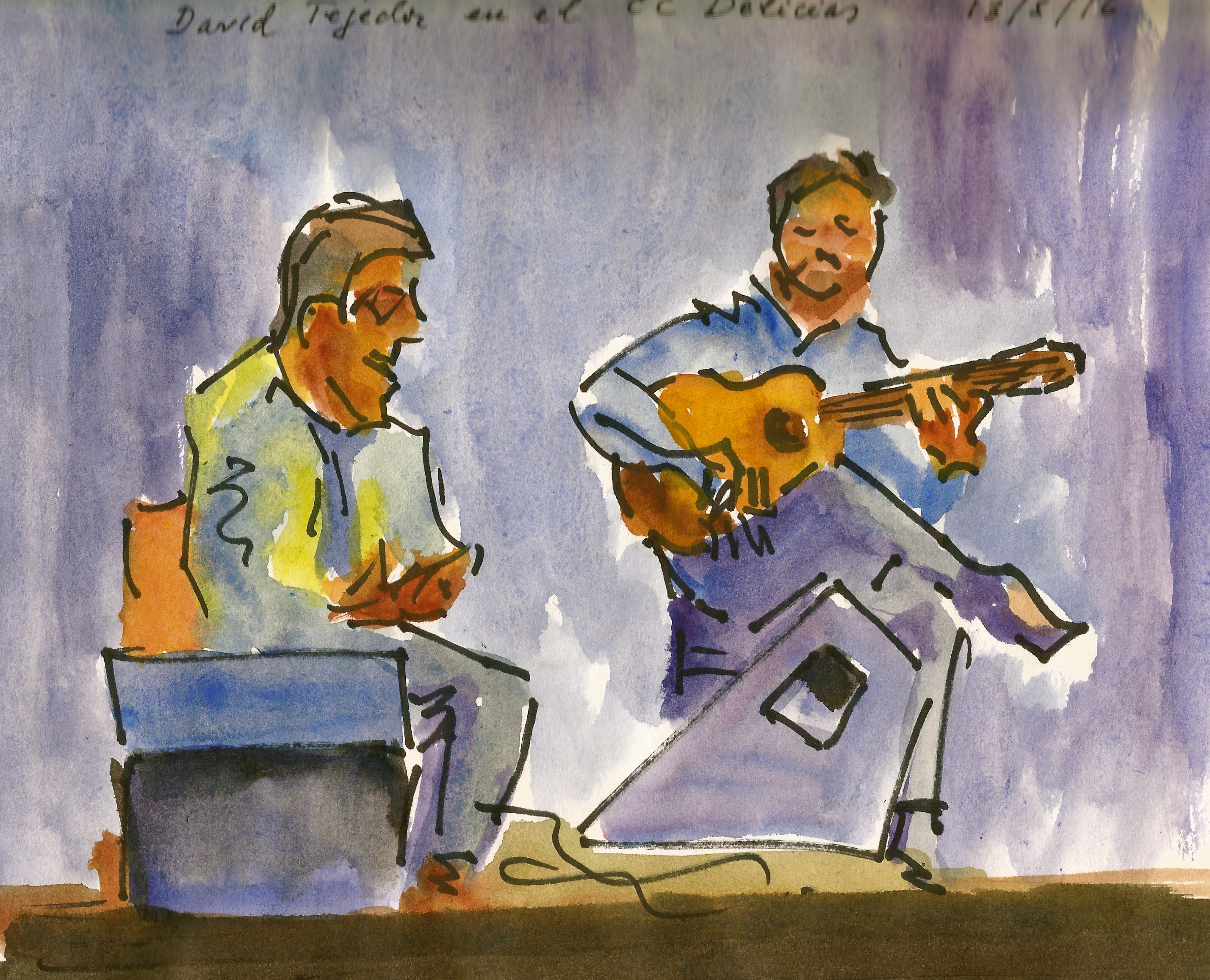 David Tejedor en la Peña Unión Flamenca de Zaragoza, 2001, tinta, tratamiento e impresión digital, y acuarela, 50 x 70 cm |