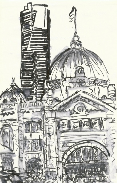 Estacion de Melbourne y Torre Eureka (tinta s cuaderno Moleskine A5)