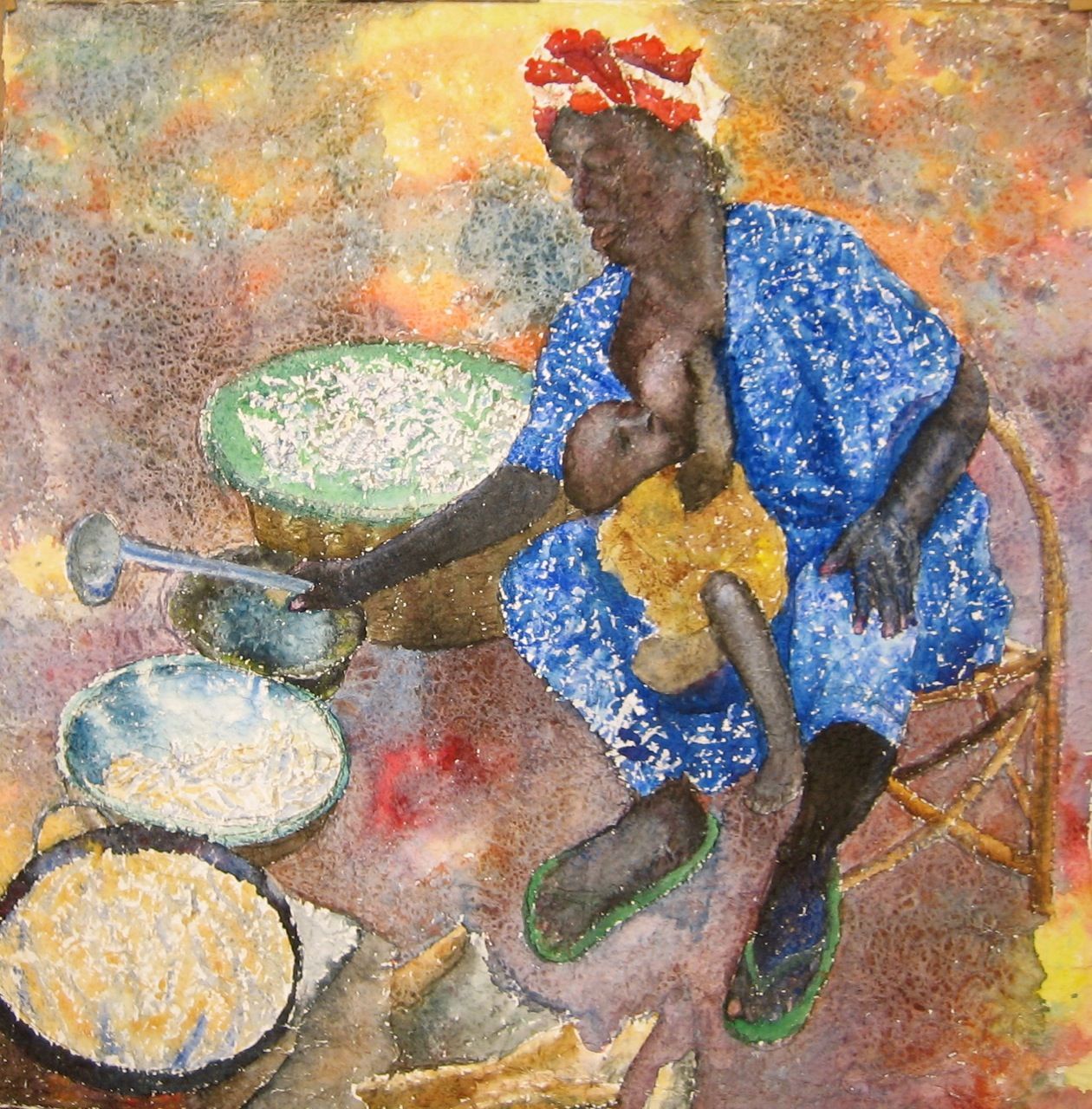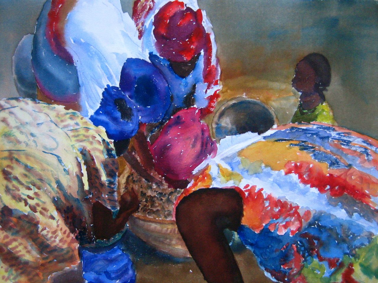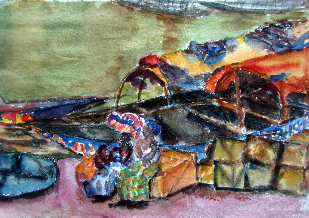 Mercado de pescado en Mopti, acuarela 70x100 cm, 2008