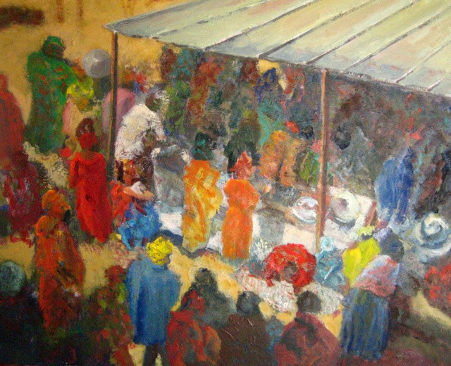 Mercado de pescado en Mopti, óleo 81x100 cm