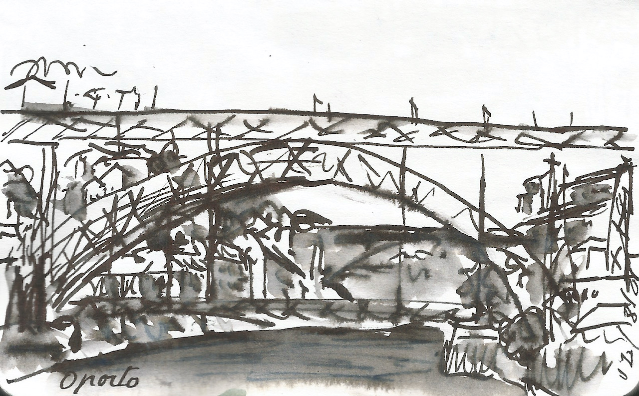 Puente en Oporto, tinta aguada sobre cuaderno 9x14 cm (8 de agosto de 2021)