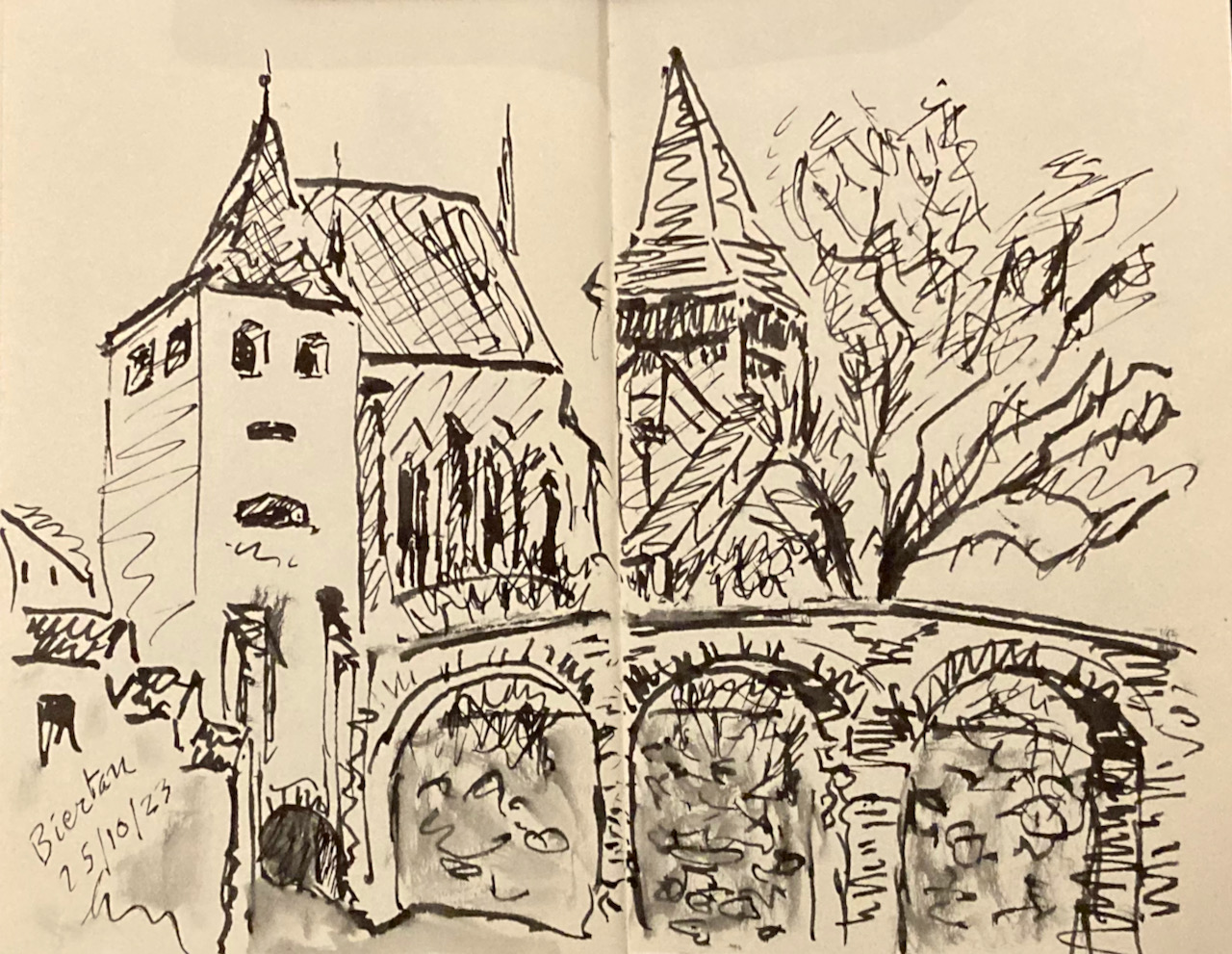 Iglesia fortaleza de Biertan (dibujo a tinta sobre cuaderno Sakura 21x13 cm) |